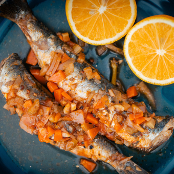 Dans la même poêle faire suer la garniture aromatique en Brunoise (Carotte, Céleri, Ail, Oignons, Thym) Puis ajouter le vinaigre, l’eau, la tomate, le sucre et deux tours de poivre, laisser frémir 10 minutes. Et verser le tout bien chaud directement sur les sardines. Laissez refroidir, réservez au frigo au moins 1h et dégustez.