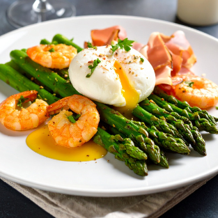 Les asperges,gambas et œuf mollet jambon de pays et vinaigre de banyuls